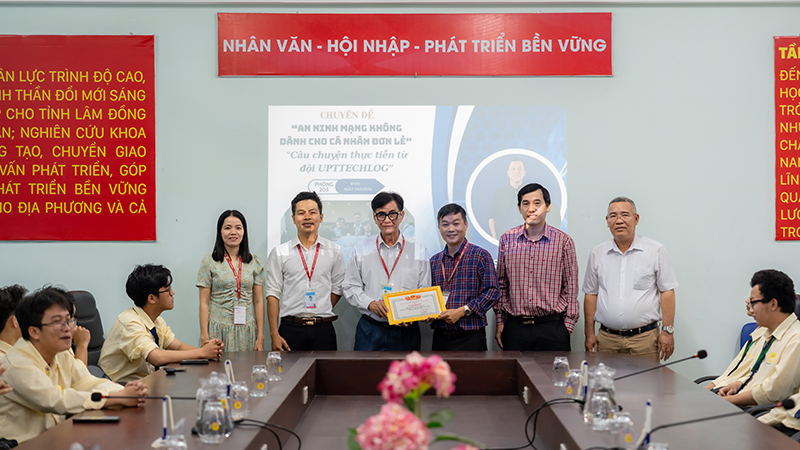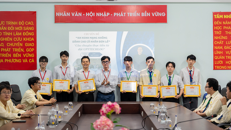 At the beginning of the program, Assoc. Prof. Dr. Dinh Phi Ho presented Certificates of Merit to the Faculty of Information Technology and the UPTTECHLOG team in recognition of their outstanding achievement in winning Second Prize at the Lam Dong Provincial Cybersecurity CTF Competition 2025. This timely recognition acknowledged the continuous efforts of faculty members and students in learning, research, and technology application, while affirming the competence and professional capacity of UPT students in the fields of information technology and cybersecurity.