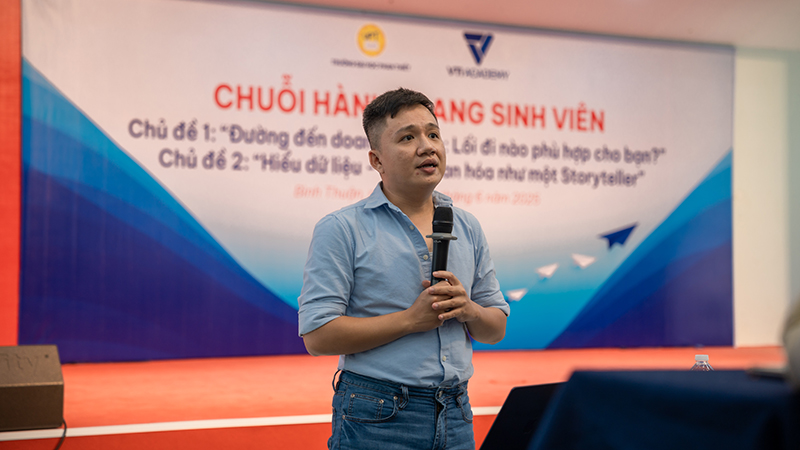 Diễn giả Đỗ Đăng Khoa cũng chia sẻ kinh nghiệm làm việc trong ngành phân tích dữ liệu, từ góc nhìn của doanh nghiệp, góp phần giúp sinh viên hiểu rõ hơn về nhu cầu thực tế và xu hướng nghề nghiệp.
