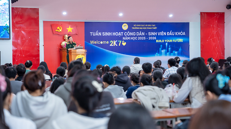 Trong khuôn khổ tuần sinh hoạt công dân đầu khóa, ngày 11/9/2025, tại hội trường Trường Đại học Phan Thiết đã diễn ra buổi giao lưu về chuyên đề với chủ đề “Xây dựng và bảo vệ Tổ quốc, bảo vệ chủ quyền biển đảo, biên giới quốc gia trong tình hình mới”.