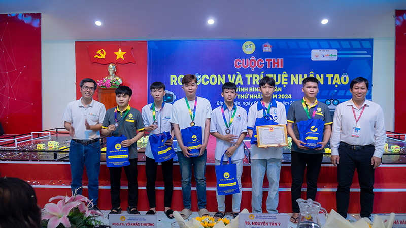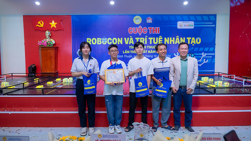 Ông Hà Văn Minh – Giám đốc – Người sáng lập Onstem Education – Nhà tài trợ kim cương cuộc thi “Robocon và Trí tuệ nhân tạo tỉnh Bình Thuận” – Lần I Năm 2024 và TS. Nguyễn Minh Tâm – Trưởng Khoa Cơ bản trường Đại học Phan Thiết trao giải cho Đội Phong cách và Đội TST giành giải ba phần thi liên minh