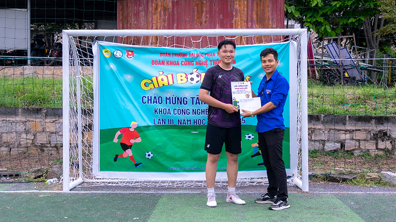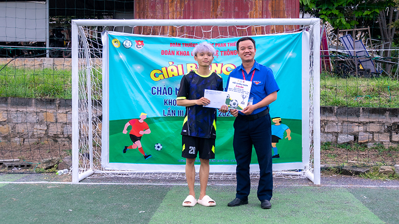 ThS. Nguyễn Hữu Tiến – Phó Bí thư Đoàn trường, Bí thư Đoàn Khoa CNTT trao giải Vua phá lưới cho cầu thủ Nguyễn Hữu Tài – Chi đoàn K16THO2