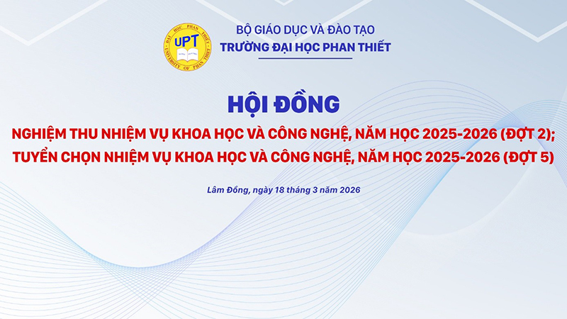 Chiều ngày 18/3/2026 (thứ 4), tại phòng họp 205, Trường Đại học Phan Thiết đã tổ chức Hội đồng nghiệm thu Nhiệm vụ Khoa học và Công nghệ, năm học 2025-2026 (Đợt 2), Hội đồng tuyển chọn Nhiệm vụ Khoa học và Công nghệ, năm học 2025-2026 (Đợt 5).