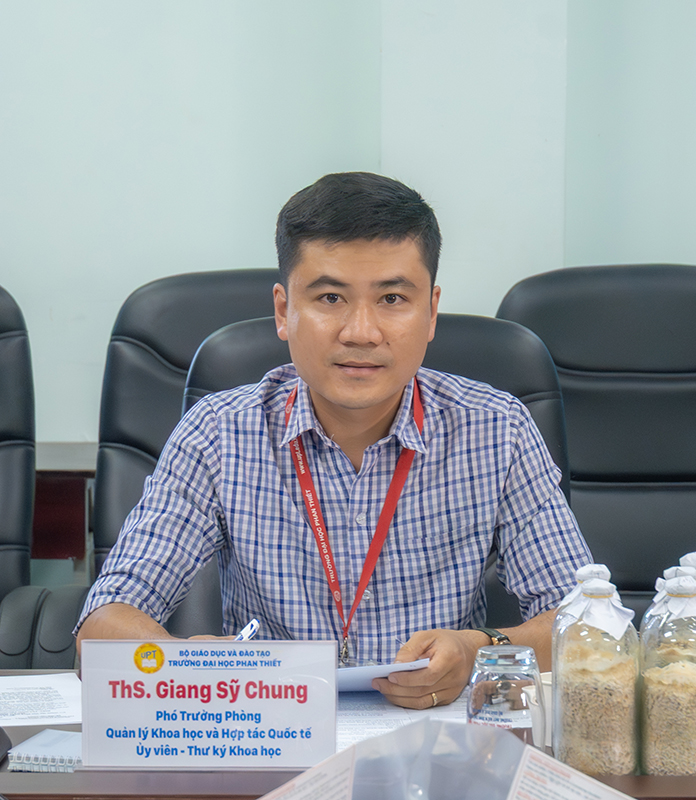 ThS. Lê Việt Kỳ – đại diện nhóm nghiên cứu trình bày báo cáo kết quả nghiên cứu đề tài NCKH cấp trường “Xây dựng quy trình phân lập, nhân giống và nuôi trồng thương phẩm nấm linh chi đỏ (Ganoderma lucidum) quy mô phòng thí nghiệm tại Trường Đại học Phan Thiết”