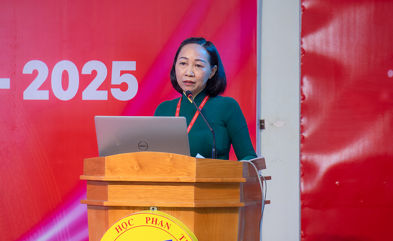 ThS. Lâm Ngọc Điệp – Chủ tịch Công đoàn trường Đại học Phan Thiết trình bày báo cáo tổng kết thực hiện phong trào thi đua “Dạy tốt” năm học 2023–2024