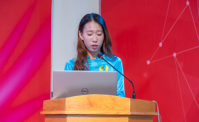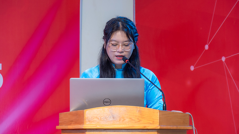 Sinh viên Bùi Trần Phương Uyên – Sinh viên khóa 13 Khoa Du lịch trường Đại học Phan Thiết trình bày báo cáo tham luận với chủ đề “Kinh nghiệm học tập có kết quả – thay đổi từ những thói quen nhỏ”