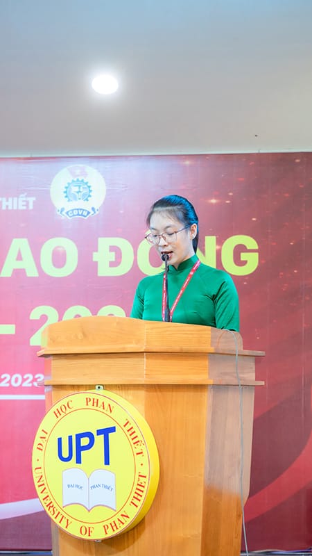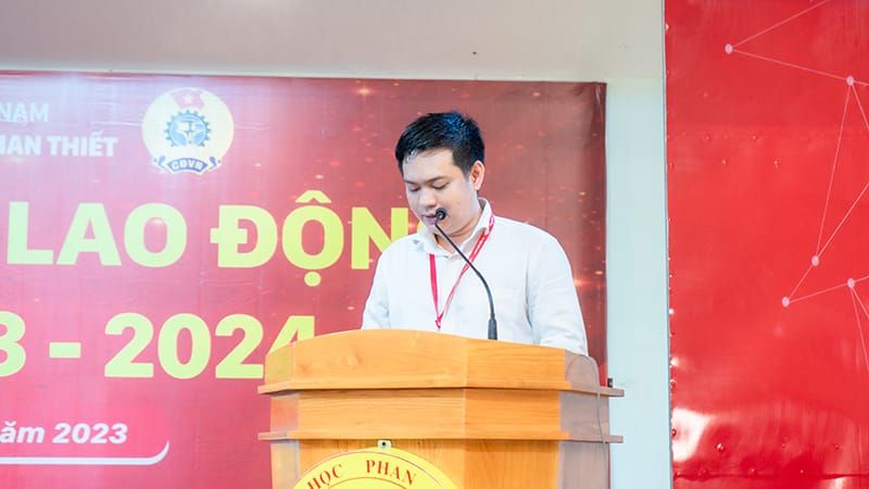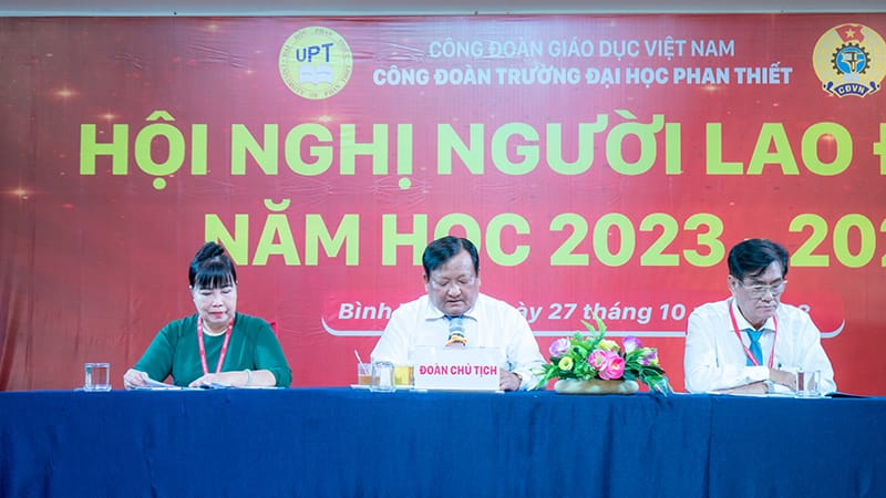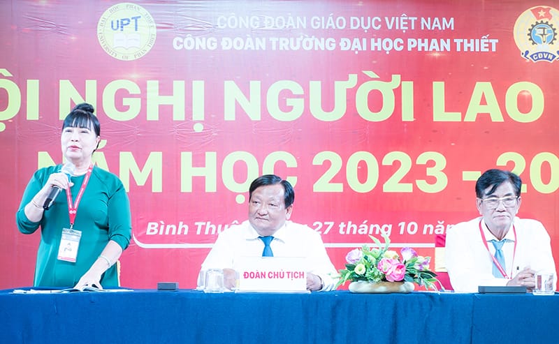 Tiếp theo chương trình, đại diện Công Đoàn trường Đại học Phan Thiết, ThS. Lâm Ngọc Điệp – Chủ tịch Công đoàn đã lần lượt trình bày báo cáo hoạt động Công đoàn và thỏa ước lao động tập thể năm học 2022-2023, đề ra phương hướng nhiệm vụ công đoàn năm học 2023-2024. Nhìn chung, trong năm qua, Công đoàn trường Đại học Phan Thiết đã hoàn thành tốt mọi mục tiêu đã đề ra, gặt hái được nhiều thành tích đáng tự hào và nhận được 01 bằng khen, 01 cờ thi đua từ Công Đoàn giáo dục Việt vì có thành tích xuất sắc trong hoạt động công đoàn.