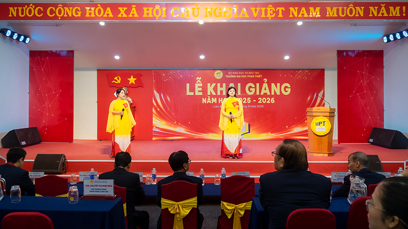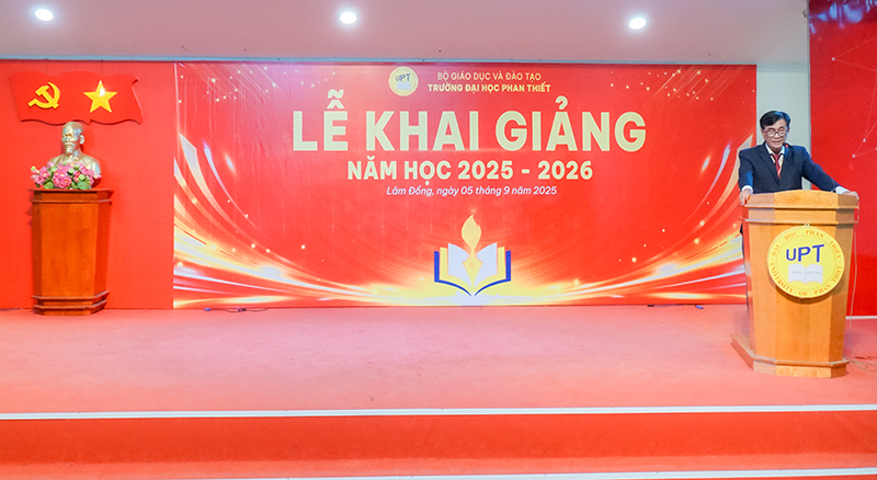 Hòa chung không khí cả nước, sáng cùng ngày, Trường Đại học Phan Thiết (UPT) đã long trọng tổ chức Lễ khai giảng năm học mới. Phát biểu tại buổi lễ, PGS.TS Đinh Phi Hổ – Bí thư Đảng ủy, Phó Hiệu trưởng Nhà trường – nhấn mạnh phương châm năm học 2025–2026 là “Nhân văn – Hội nhập – Phát triển bền vững”. Nhà trường đề ra bốn nhiệm vụ trọng tâm gồm nâng cao chất lượng đào tạo, đẩy mạnh nghiên cứu khoa học và hợp tác quốc tế, ứng dụng công nghệ thông tin và chuyển đổi số, xây dựng môi trường giáo dục đoàn kết, nhân văn, phát triển bền vững.