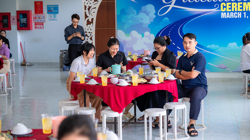 Sau phần lễ trang trọng là “Bữa cơm Công đoàn” – một hoạt động đầy ấm cúng và ý nghĩa, thể hiện tinh thần gắn bó, chia sẻ giữa các đoàn viên. Đây là dịp để cán bộ, giảng viên, nhân viên giao lưu, thắt chặt thêm tình đoàn kết, tạo động lực phấn đấu cho một năm học mới hiệu quả và thành công.
