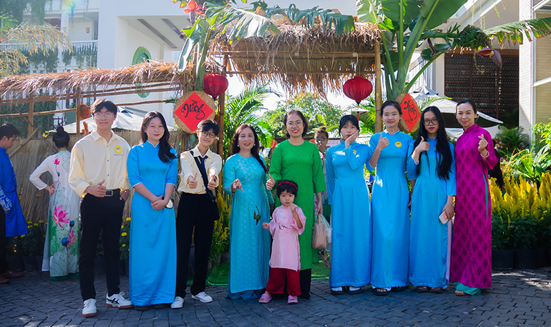 Không gian lễ hội năm nay được trang trí lộng lẫy với gam màu đỏ may mắn, sắc vàng rực rỡ của hoa mai và những hình ảnh đặc trưng của Tết cổ truyền. Bên trong khuôn viên sự kiện, hình ảnh mái nhà tranh, câu đối đỏ, và những mâm ngũ quả đầy đặn được bày biện cẩn thận đã mang đến cho tất cả mọi người cảm giác ấm áp, thân thuộc của ngày Tết Việt Nam.
