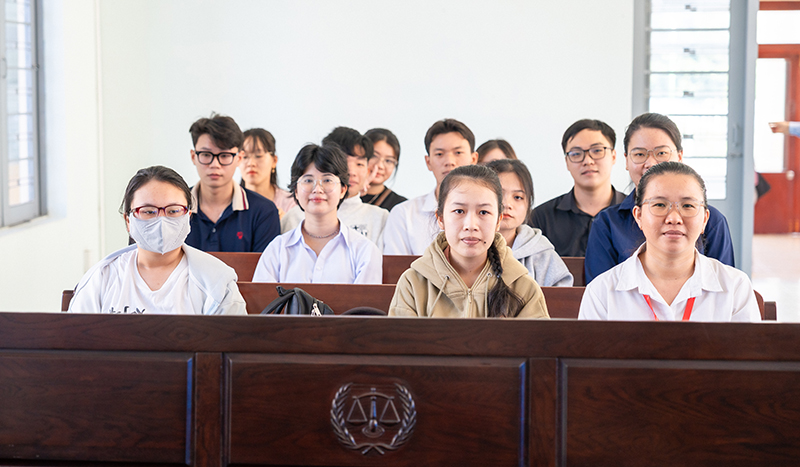 Trong chuyến học tập thực tế, sinh viên đã được trực tiếp tham dự một phiên tòa dân sự với nội dung liên quan đến tranh chấp hợp đồng chuyển nhượng quyền sử dụng đất, thụ lý yêu cầu độc lập về tranh chấp hợp đồng tín dụng và tranh chấp hợp đồng thế chấp quyền sử dụng đất. Việc được tiếp cận và quan sát diễn biến phiên tòa giúp sinh viên hiểu rõ hơn về quy trình tố tụng, cách thức Hội đồng xét xử điều hành phiên tòa, cách các bên trình bày chứng cứ, lập luận, cũng như vai trò của Kiểm sát viên trong giám sát hoạt động tố tụng. Đặc biệt, trải nghiệm này còn góp phần nâng cao khả năng quan sát, phân tích tình huống pháp lý và củng cố kiến thức ngành Luật mà các em đã được học trên giảng đường.