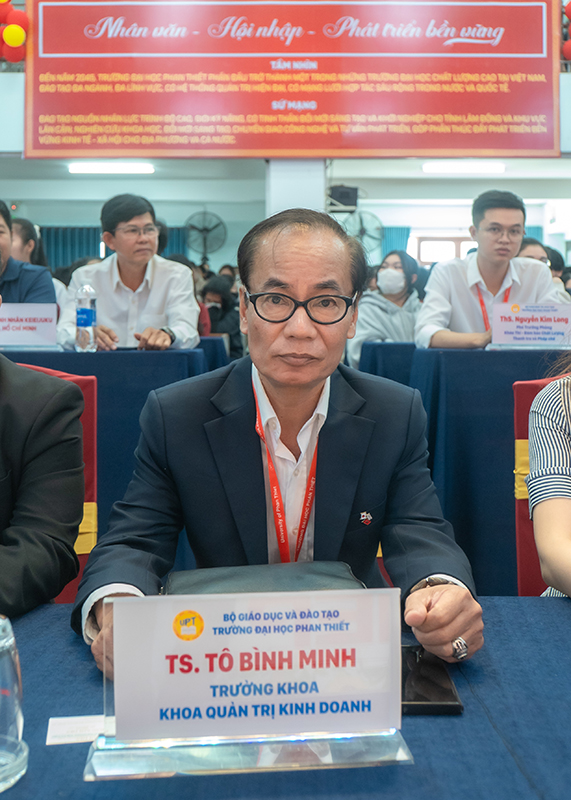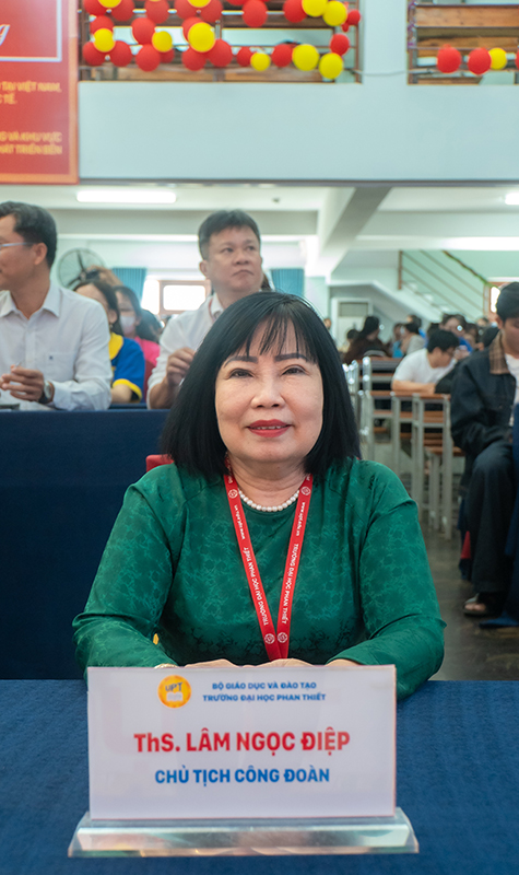 Attending the program from University of Phan Thiet were Assoc. Prof. Dr. Võ Khắc Thường, Chairman of the University Council and Rector; Ms. Nguyễn Anh Đông, Member of the University Council, Deputy Secretary of the Party Committee, Head of Planning – Finance Department; M.Sc. Lâm Ngọc Điệp, Chairman of the University Trade Union; Dr. Tô Bình Minh, Head of the Faculty of Business Administration; together with faculty, staff, and more than 300 students of the University.