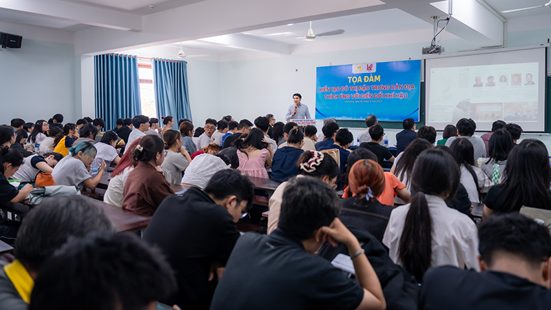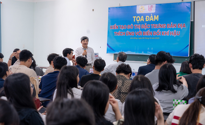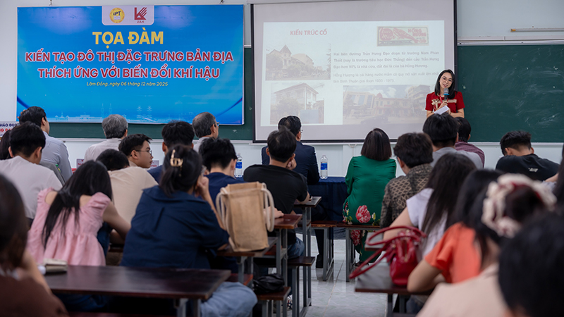 Trong bối cảnh biến đổi khí hậu đang trở thành thách thức toàn cầu, Trường Đại học Phan Thiết đã phối hợp cùng Trường Đại học Kiến trúc TP.HCM tổ chức thành công buổi Tọa đàm khoa học “Kiến tạo đô thị đặc trưng bản địa thích ứng với biến đổi khí hậu” vào sáng thứ bảy, ngày 6/12/2025 tại Trường Đại học Phan Thiết. Sự kiện này không chỉ là cầu nối hợp tác đào tạo giữa hai trường mà còn là nền tảng quan trọng để nâng cao nhận thức cho sinh viên về các Mục tiêu Phát triển Bền vững của Liên Hợp Quốc, đặc biệt là hai mục tiêu “Thành phố và Cộng đồng Bền vững (SDG 11)” và “Hành động chống lại Biến đổi Khí hậu (SDG 13)”. Với sự tham gia nhiệt tình của hơn 120 giảng viên và sinh viên đến từ cả hai trường, buổi tọa đàm đã cung cấp những hiểu biết và nhận thức thiết thực giúp thế hệ trẻ sẵn sàng đóng góp vào một tương lai xanh và phát triển bền vững.