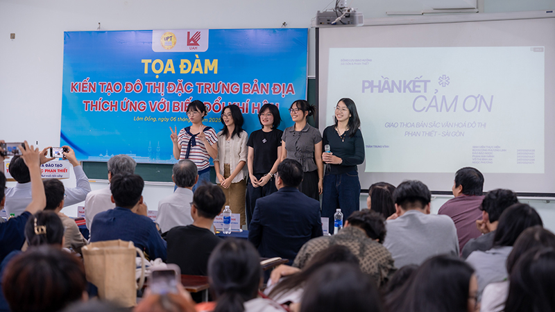 Nhóm sinh viên đến từ Khoa Quy hoạch – Trường Đại học Kiến trúc TP.HCM cũng đã tạo dấu ấn với bài thuyết trình ấn tượng về “Đồng lưu giao hưởng: Giao thoa bản sắc văn hóa đô thị Phan Thiết – Sài Gòn”, khơi dậy góc nhìn trẻ trung về sự kết nối lịch sử và hiện đại, khuyến khích thảo luận về các mô hình đô thị bền vững.