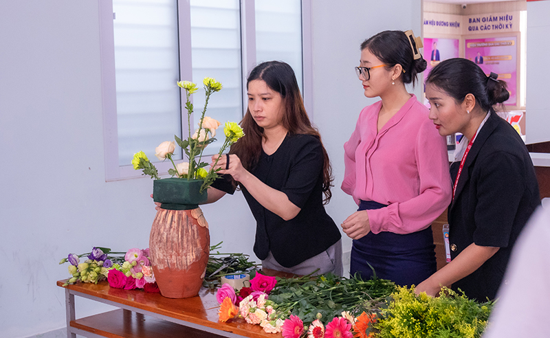 Đầu tiên là phần thi cắm hoa, được sự tham gia tích cực của 7 tổ công đoàn, hưởng ứng nhiệt tình thể hiện tinh thần gắn bó, đoàn kết và chung sức chung lòng giữa thành viên trong tổ và cá nhân. Các tổ đã có đầu tư về nghệ thuật, đặc biệt có một số tác phẩm có sự sáng tạo về ý tưởng, được Ban Giám khảo đánh giá cao. Các tác phẩm nhìn chung đều xoay quanh chủ đề người Phụ nữ Việt Nam, nhìn nhận sâu sắc về sự hy sinh to lớn của người phụ nữ năng động sáng tạo trong thời kỳ mới. Qua đó, các tác phẩm cũng đã thể hiện tâm huyết, sự kỳ vọng đối với quá trình hoạt động và phát triển của Nhà trường.
