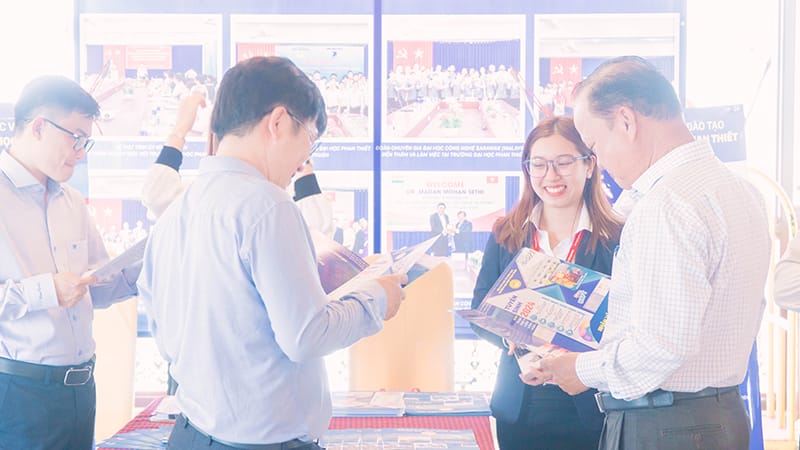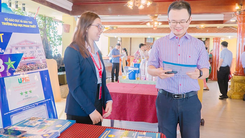 Đại diện các doanh nghiệp tham khảo các thông tin của trường Đại học Phan Thiết tại Hội nghị
