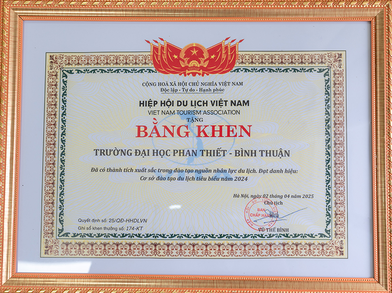 Ngày 10/4 vừa qua, Trường Đại học Phan Thiết (UPT) đã vinh dự được Hiệp hội Du lịch Việt Nam trao tặng danh hiệu “Cơ sở đào tạo du lịch tiêu biểu năm 2024”. Đây là sự ghi nhận xứng đáng cho những nỗ lực không ngừng trong việc xây dựng môi trường học tập chuyên nghiệp, hiện đại và gắn liền với thực tiễn ngành du lịch.