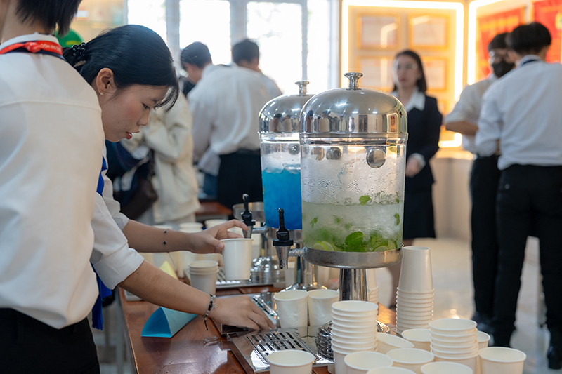 Nhóm học sinh đầu tiên đã được tham quan Khu vực Lễ tân và Phòng Pha chế, dưới sự dẫn dắt của Khoa Du lịch. Tại đây, các em học sinh được giới thiệu tổng quan về quy trình tiếp đón, phục vụ khách trong môi trường khách sạn – nhà hàng, đồng thời tìm hiểu các kỹ năng nghiệp vụ quan trọng của ngành Du lịch như giao tiếp, tác phong nghề nghiệp và kỹ năng xử lý tình huống. Đặc biệt, trong quá trình tham quan, các em còn được trực tiếp thưởng thức các món thức uống do sinh viên ngành Quản trị Nhà hàng và Dịch vụ ăn uống Khoa Du lịch pha chế, qua đó cảm nhận rõ hơn tính ứng dụng thực tiễn và sự chuyên nghiệp trong chương trình đào tạo của Nhà trường. Những hoạt động trải nghiệm sinh động này không chỉ giúp học sinh hiểu rõ hơn về ngành nghề mà còn tạo thêm hứng thú, động lực cho những em yêu thích lĩnh vực Du lịch, Khách sạn và Nhà hàng.