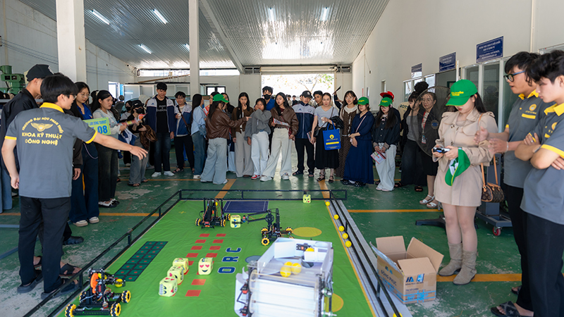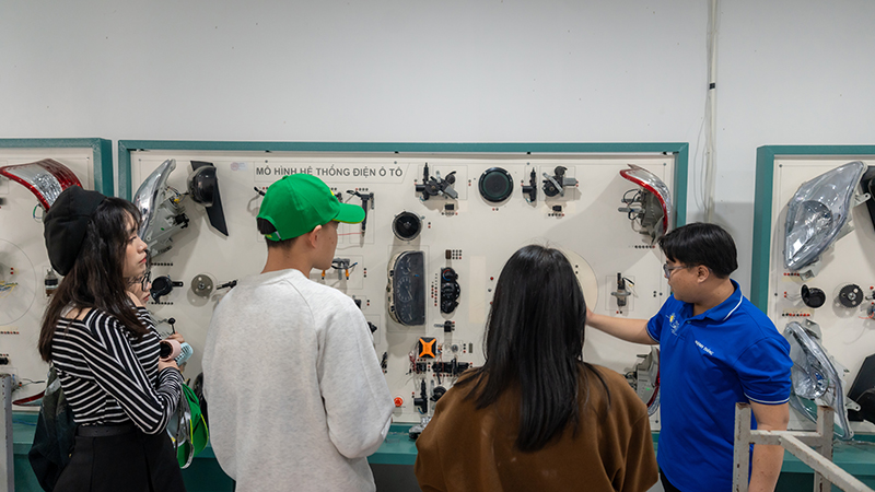 Nhóm học sinh tiếp theo được đưa đến Xưởng Thực hành Kỹ thuật – Công nghệ, khu vực do Khoa Kỹ thuật – Công nghệ phụ trách. Đây là nơi các sinh viên của Khoa thực hành các kỹ năng chuyên môn trong các ngành như Kỹ thuật Ô tô, Cơ – Điện tử, và Cơ khí. Các em học sinh đã được chứng kiến các mô hình, thiết bị và công nghệ hiện đại đang được áp dụng trong giảng dạy tại UPT. Việc trực tiếp tiếp xúc với các thiết bị công nghệ giúp các em hình dung rõ hơn về ngành học, cũng như cơ hội nghề nghiệp trong lĩnh vực này.