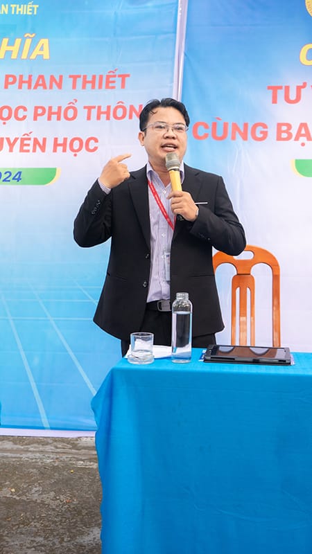 After the career guidance session of Dr. Nguyen Tan Y, Associate Professor, Dr. Dinh Phi Ho – Party Cell Secretary – Vice Principal of Phan Thiet University also gave an overview to all students of Ham Thuan Bac High School about the process of formation, development, and outstanding achievements that Phan Thiet University has achieved for many consecutive years. With increasingly affirmed training quality, along with many humane and practical admission policies, Associate Professor, PhD. Dinh Phi Ho believes that Phan Thiet University can become one of the most optimal choices for students of Ham Thuan Bac High School in particular and students of Binh Thuan province in general.
