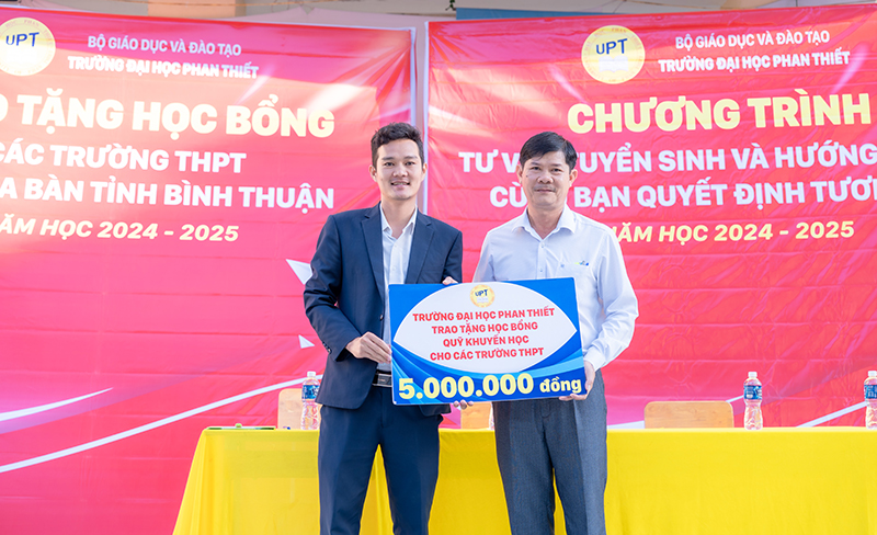 ThS. Lương Quốc Vũ – Phó Trưởng Phòng Quản lý Đào tạo đại diện trường Đại học Phan Thiết trao tặng học bổng cho trường Phổ thông Dân tộc Nội trú tỉnh Bình Thuận