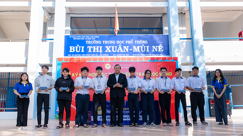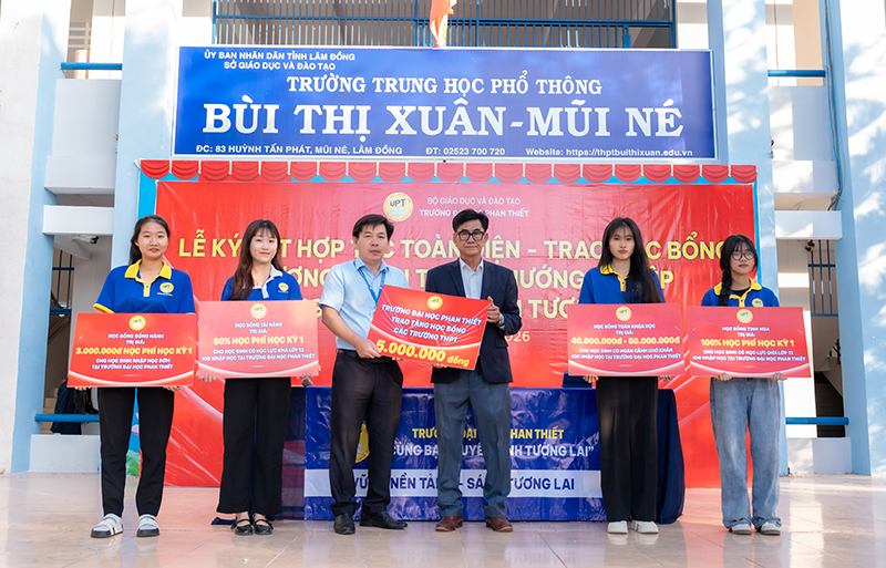 Nhân dịp này, Trường Đại học Phan Thiết đã trao tặng 5.000.000 đồng vào quỹ học bổng của Trường THPT Bùi Thị Xuân – Mũi Né. Bên cạnh đó, UPT cam kết dành các suất học bổng đầu vào không giới hạn cho học sinh của nhà trường khi đăng ký xét tuyển vào bất kỳ ngành đào tạo nào tại Trường Đại học Phan Thiết trong kỳ tuyển sinh năm 2026, với giá trị học bổng từ 3.000.000 đồng đến 50.000.000 đồng cho toàn khóa học. Đây được xem là bước tiến quan trọng, góp phần mở ra nhiều cơ hội học tập và phát triển nghề nghiệp cho học sinh Trường THPT Bùi Thị Xuân – Mũi Né trong thời gian tới.