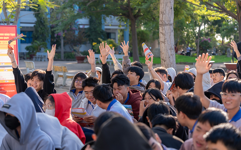 The atmosphere of the program became more vibrant during the interactive Q&A session between students and representatives of University of Phan Thiet. Many questions regarding admission methods, employment opportunities, scholarships, and student life were answered in detail. Notably, the sharing session by a former student of Bui Thi Xuan – Mui Ne High School, who is currently studying at Phan Thiet University, brought authentic and relatable stories about academic and personal development in the university environment, thereby inspiring and motivating Grade 12 students.