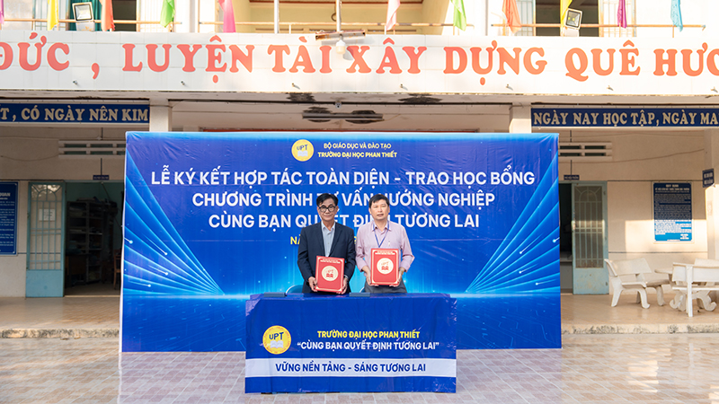 Ngay sau chương trình tư vấn, lễ ký kết hợp tác toàn diện giữa Trường Đại học Phan Thiết và Trường THPT Nguyễn Thị Minh Khai đã được tổ chức trang trọng. Nội dung hợp tác tập trung vào các hoạt động tư vấn hướng nghiệp – tuyển sinh; giao lưu học thuật, văn hóa, thể thao; đồng thời triển khai các chương trình học bổng và hỗ trợ học sinh trong năm học 2025–2026 và các năm tiếp theo.