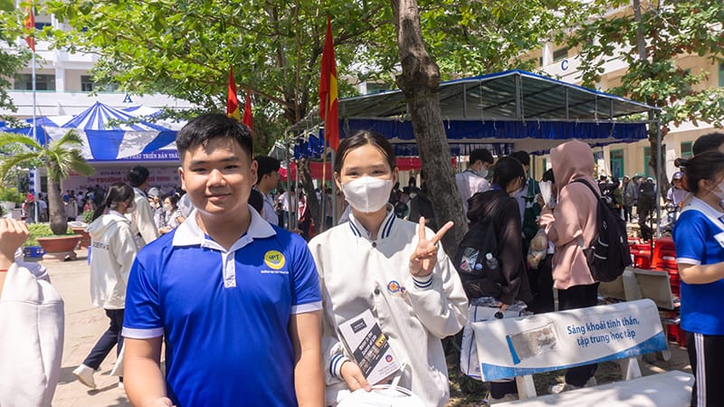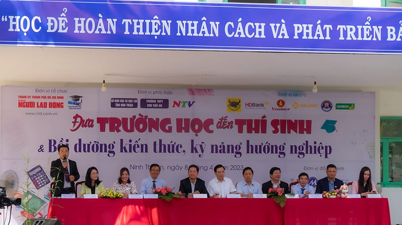 On the morning of April 8, 2023, Phan Thiet University participated in the program “Bringing schools to candidates” – The 22nd time in 2023 organized by Nguoi Lao Dong Newspaper. The program took place at Chu Van An High School (Phan Rang City – Thap Cham, Ninh Thuan Province) with the participation and enthusiastic response of nearly 2,000 grade 12 students from high schools in the province.