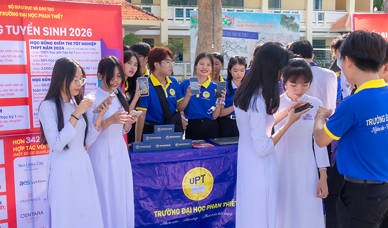 Tại gian hàng, đội ngũ tư vấn của UPT đã giới thiệu tổng quan về các ngành đào tạo nổi bật của trường, đồng thời phân tích xu hướng nguồn nhân lực trong giai đoạn chuyển đổi số, yêu cầu của từng nhóm ngành và triển vọng nghề nghiệp sau khi tốt nghiệp. Nhiều học sinh Trường THPT Bắc Bình đã mạnh dạn đặt câu hỏi về lựa chọn ngành học, chương trình đào tạo, học bổng, học phí và cơ hội việc làm. Tất cả thắc mắc đều được giải đáp rõ ràng và chi tiết, giúp các em có cái nhìn thực tế hơn về con đường học tập và nghề nghiệp trong tương lai.