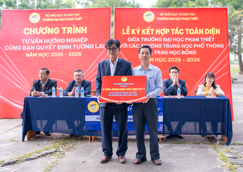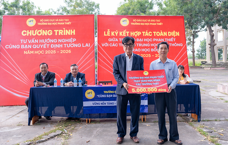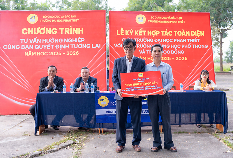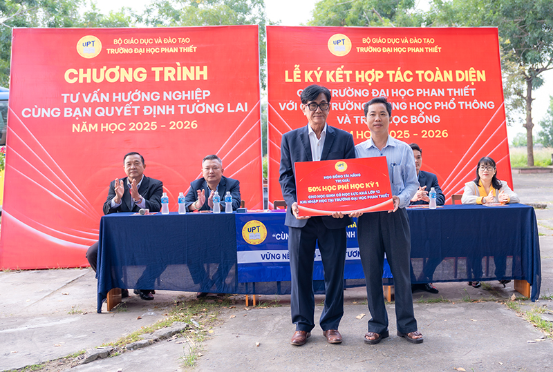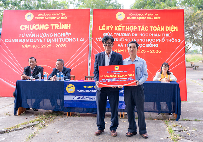 Đặc biệt, tại chương trình, Trường Đại học Phan Thiết đã trao tặng một suất học bổng trị giá 5.000.000 đồng vào quỹ học bổng của Trường THPT Nguyễn Văn Linh nhằm phục vụ các mục đích giáo dục. Bên cạnh đó, Trường Đại học Phan Thiết cam kết trao học bổng đầu vào không giới hạn số lượng cho toàn bộ học sinh Trường THPT Nguyễn Văn Linh khi các em đăng ký nhập học vào bất kỳ ngành nào của UPT trong kỳ tuyển sinh năm 2026. Mỗi suất học bổng có giá trị dao động từ 3.000.000 đồng đến 50.000.000 đồng cho toàn khóa học.